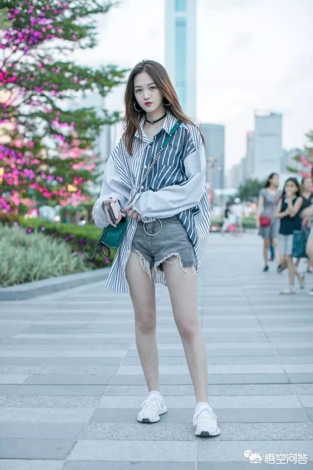 图1:oversize条纹衬衫不规则短牛仔裤白色运动鞋。时髦又优雅的打扮~